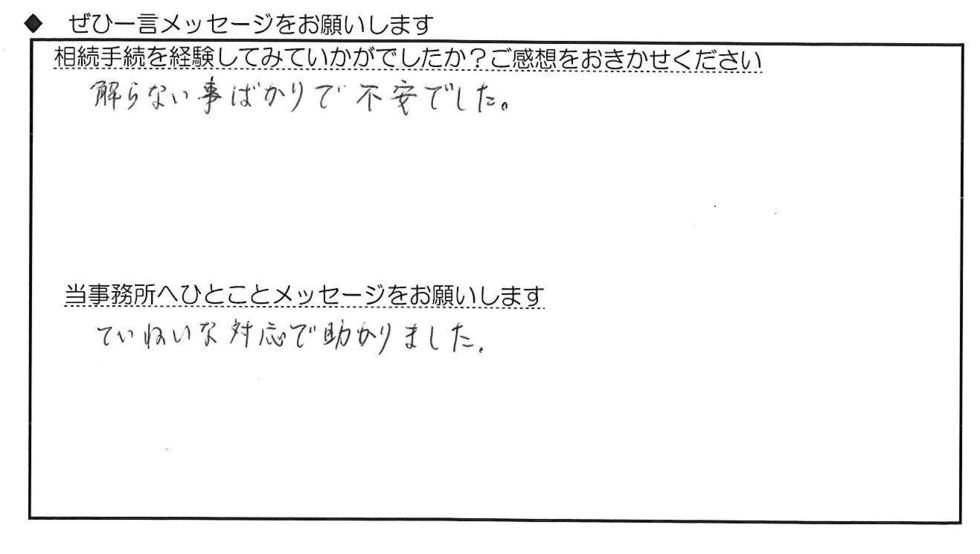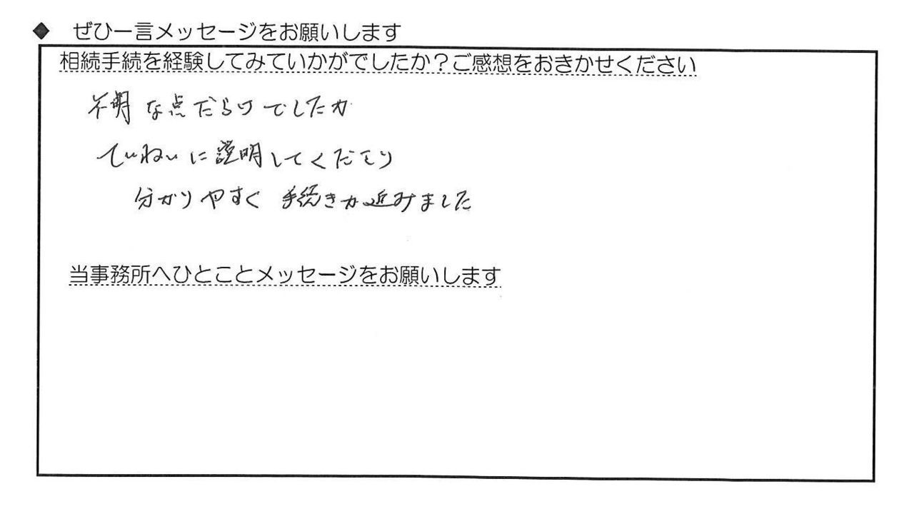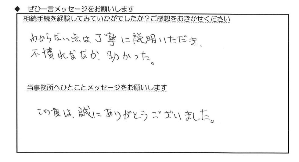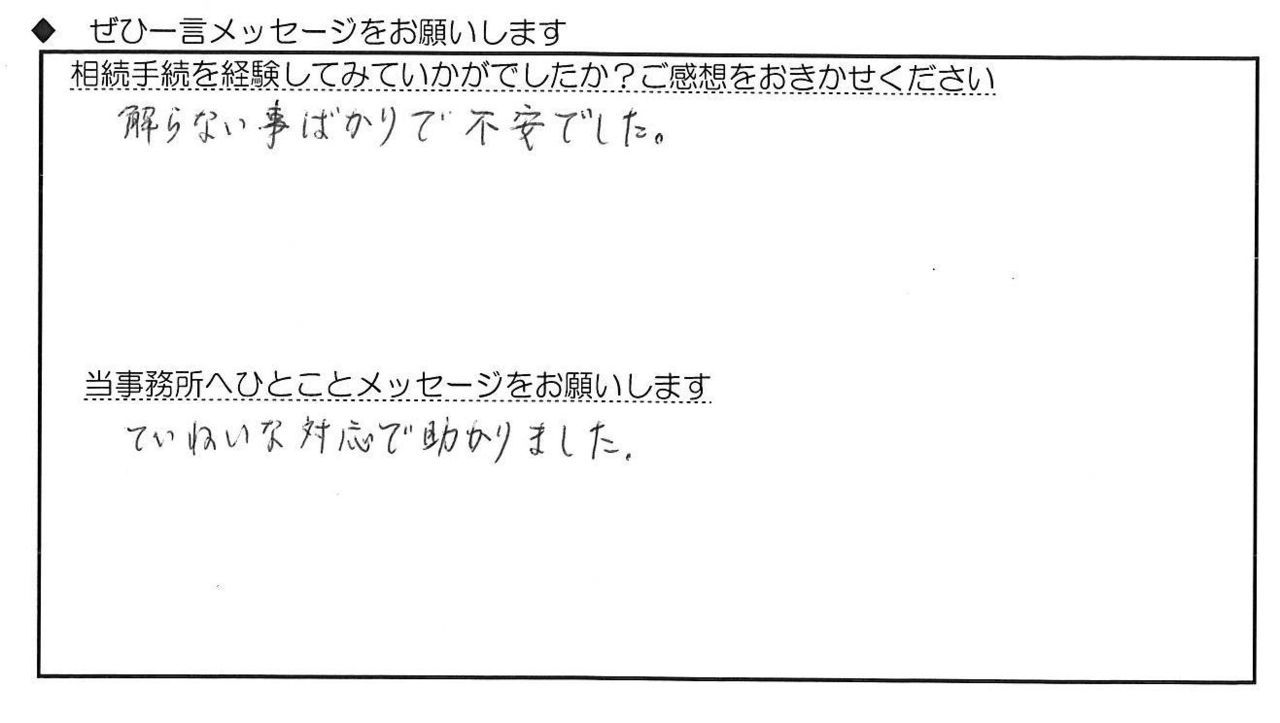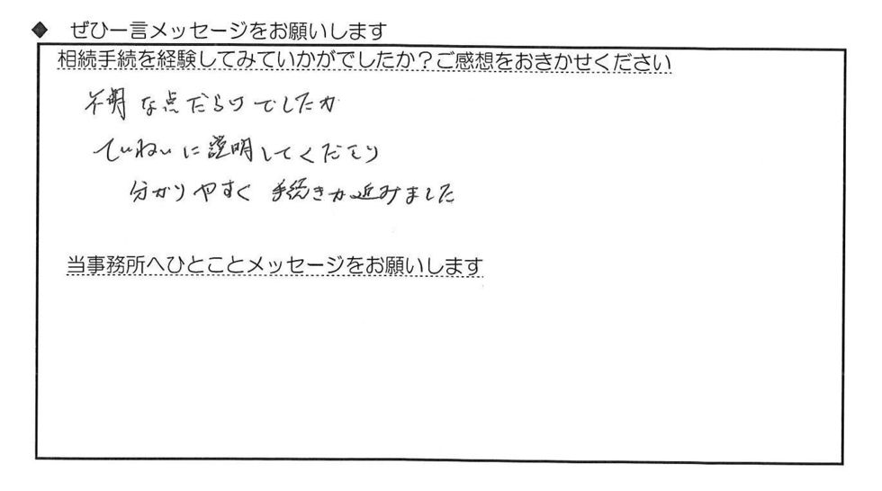 手続きの開始から全て完了迄、今年のコロナ禍の中、何度も来訪していただき、又、TEL、メール等で連絡を親切に誠意ある対応をしてもらいほんとうに感謝しております。ありがとうございました。