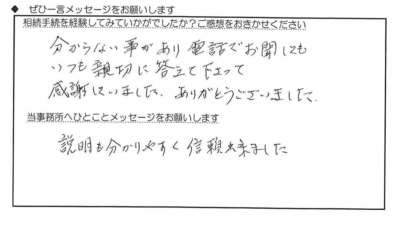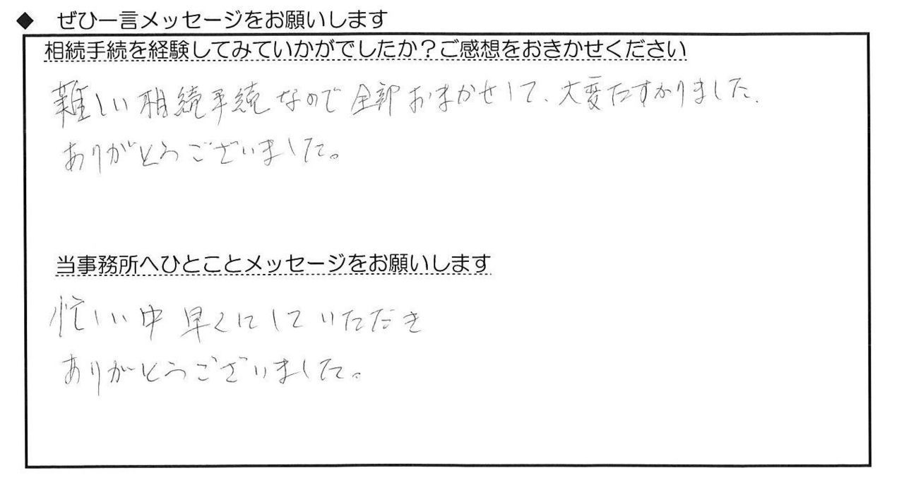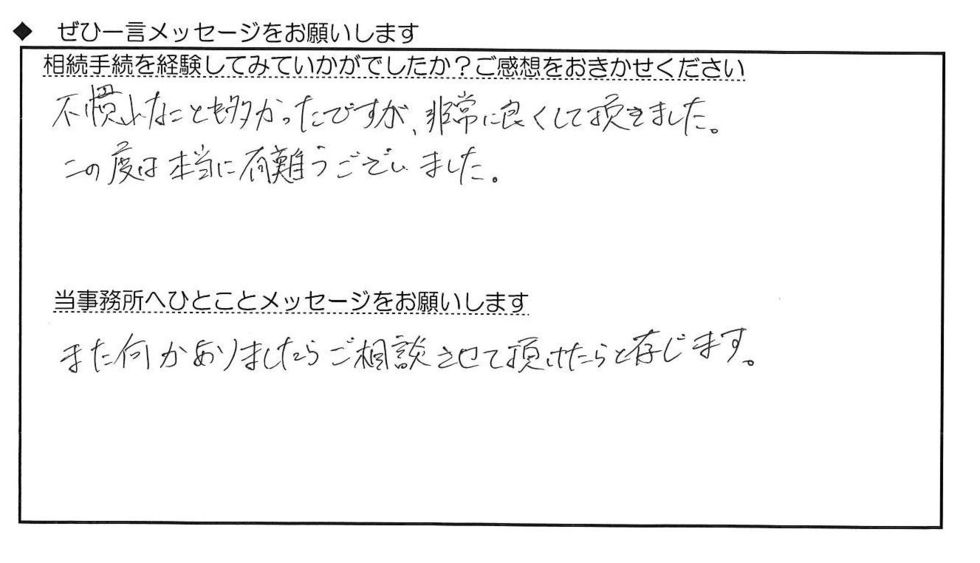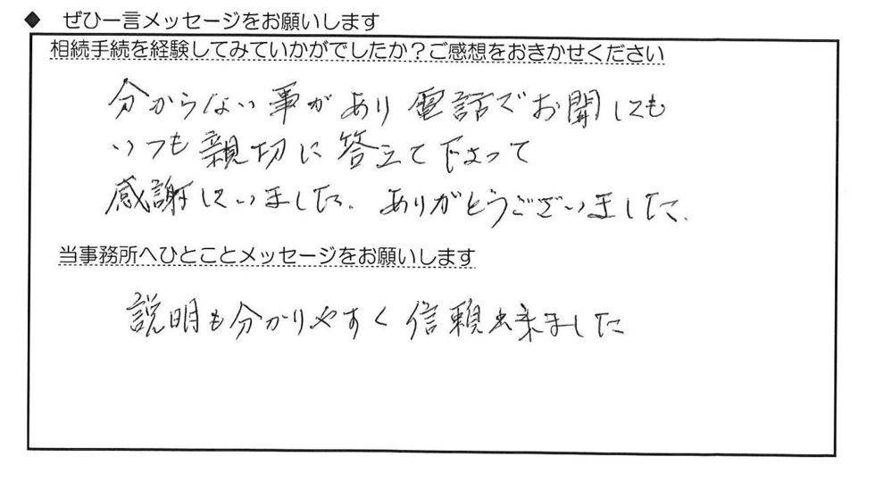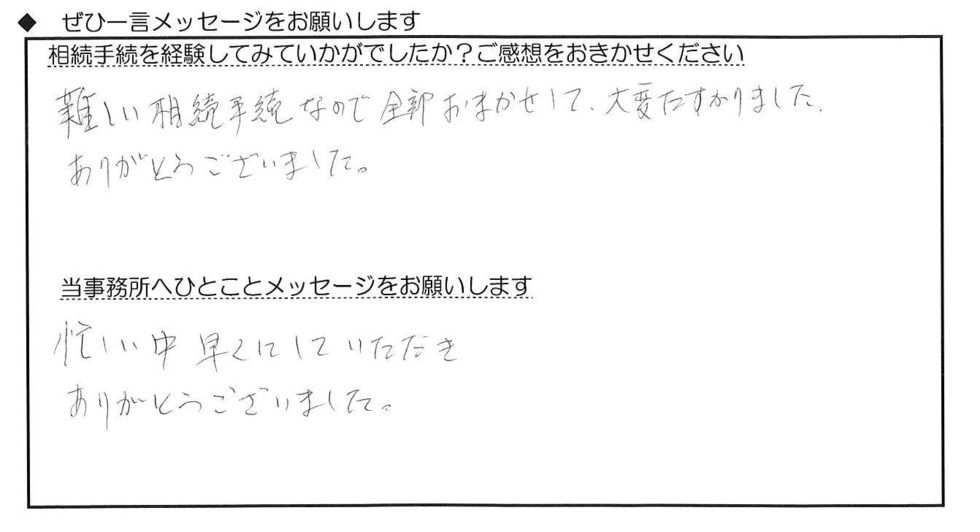 手続きの開始から全て完了迄、今年のコロナ禍の中、何度も来訪していただき、又、TEL、メール等で連絡を親切に誠意ある対応をしてもらいほんとうに感謝しております。ありがとうございました。