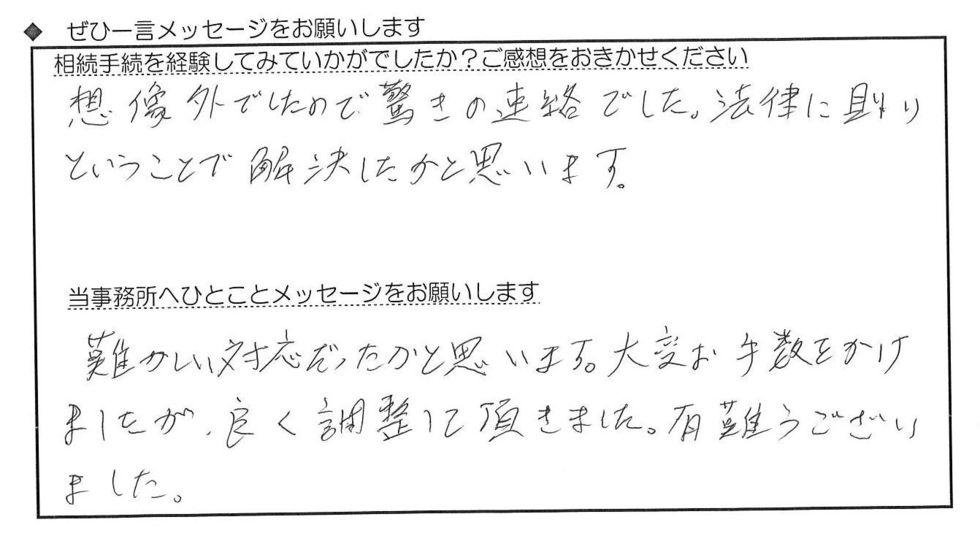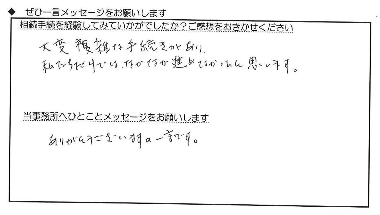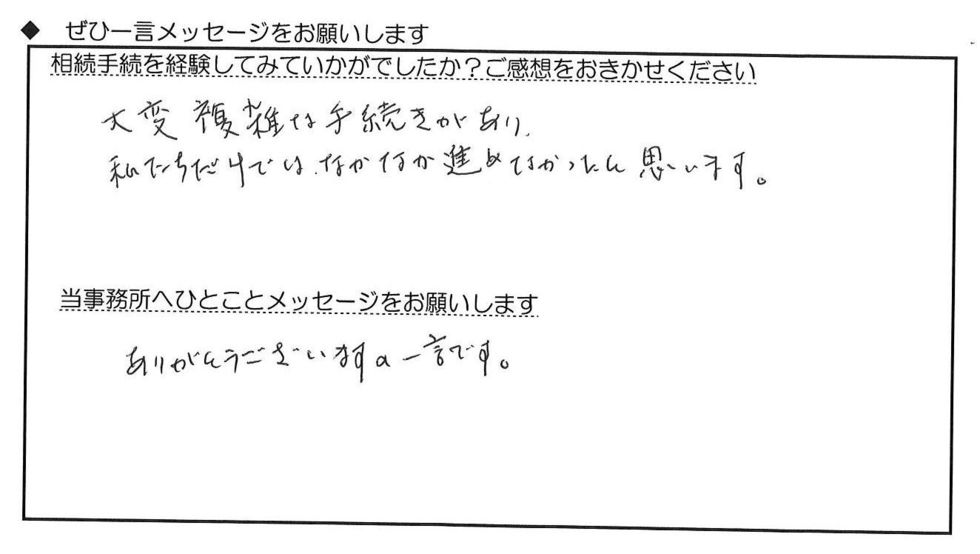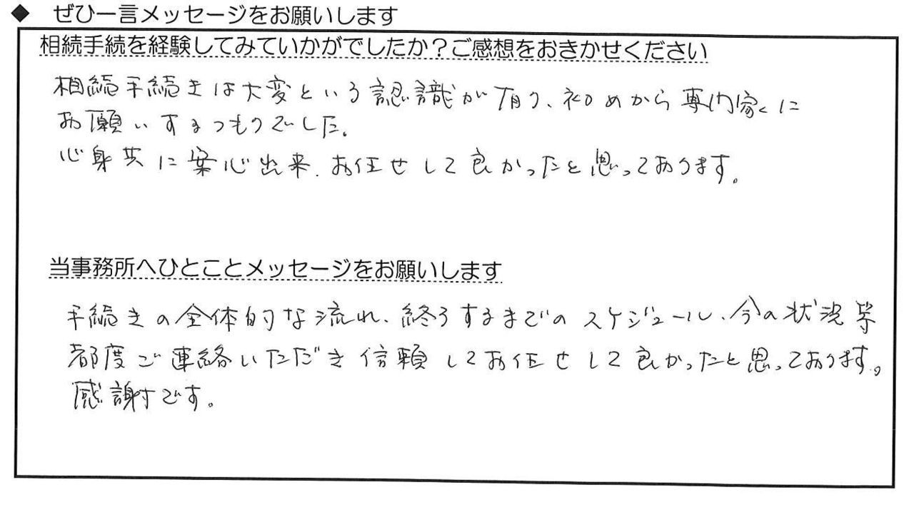 相続は、父・夫に続き3度目でしたが、今回は不動産もあり複雑だったので、初めてプロの方に手続きをお願いしました。
