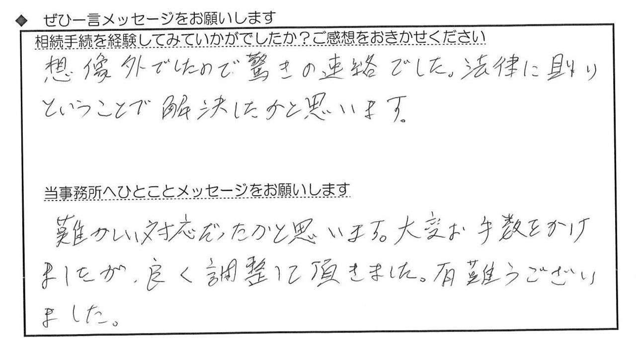 初めて相続に直面して、手続きについては、ネットや相続の本等で調べれば難なく出来ると思って進めたところ、戸籍謄本集めの途中で行き詰り、三雲さんにお願いすることにしました。専門職とはいい説明を聞いていくうちに、沢山の手続き内容に驚くばかりでした。相続人6人に対しては、私に成り代わり対応していただき本当に助かりました。